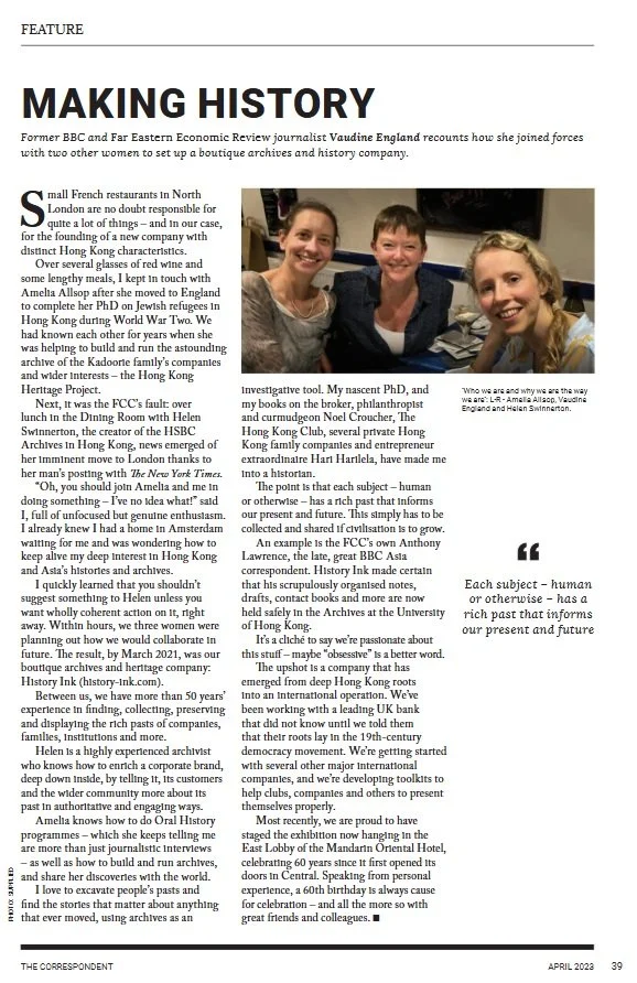 To learn more about History Ink, read Vaudine England’s article, ‘Making History’ featured in the April 2023 issue of The Foreign Correspondents’ Club, Hong Kong ‘The Correspondent’ magazine, page 39.
